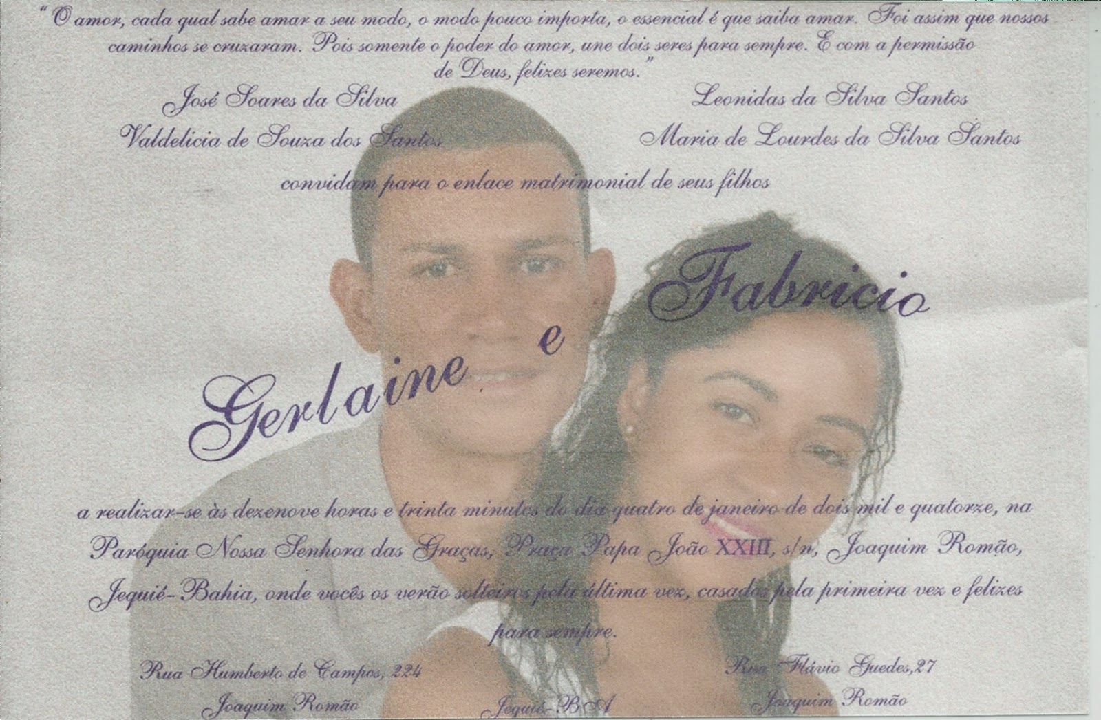 No início do ano novo nós já temos um grande momento para nossa alegria e satisfação, é o enlace matrimonial de Gerlaine e fabrício, dois jovens do Grupo de Jovens JUDE da Comunidade Nossa Senhora da Conceição, que estão prestes a formar mais uma família cristã católica que, alicerçados na fé e no amor formam um casal lindo, maravilhoso e abençoado por Deus. Estão todos convidados para este dia de festa e união, que será realizado na Paróquia Nossa Senhora das Graças, às 19:30 horas, do dia 04 de janeiro de 2014.